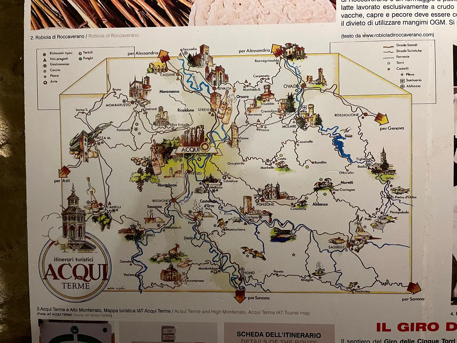 Dit dorpje heeft een historisch centrum uit 1050 en kent een groot klooster. Het dorp ligt bij de brug over Bormida di Millesimo. De vierkante en spitsige toren hoort bij de kloosterkerk van castello di Monastero Bormida. Neem ook hier even de tijd om rond te wandelen in het klooster. Geniet van de prachtige mozaïekvloer en de weelderige fresco’s.